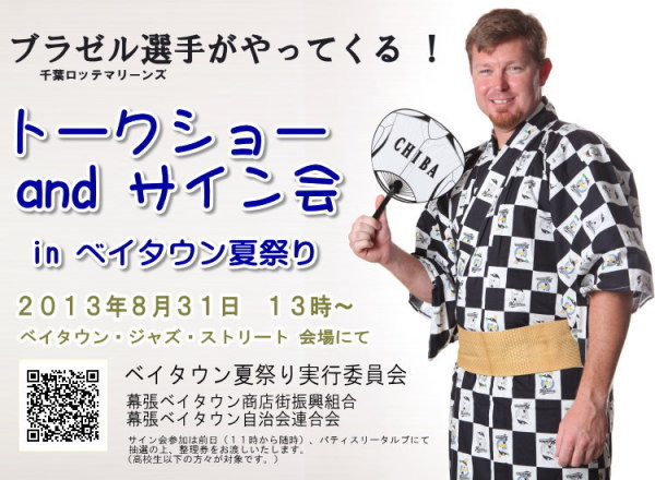 既報の通り、ベイタウン夏祭りの特別企画として、13時から、千葉ロッテマリーンズのブラゼル選手のトークショーを開催いたします。
