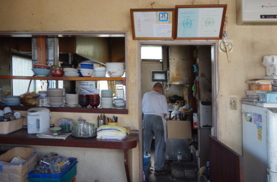 午後1時少し前。スカーンとした昔の海岸通りにひっそりと佇む一軒の店。暖簾も出してないから、そこが店なのかどうか、また、やってるのかどうかわからない。辛うじて、段ボールを適当に切った札に、「営業中」と手書きで書いてあった。店の扉は開けっ放い。お客さんはいない。ぼんやりとテレビを観ているお父さん。